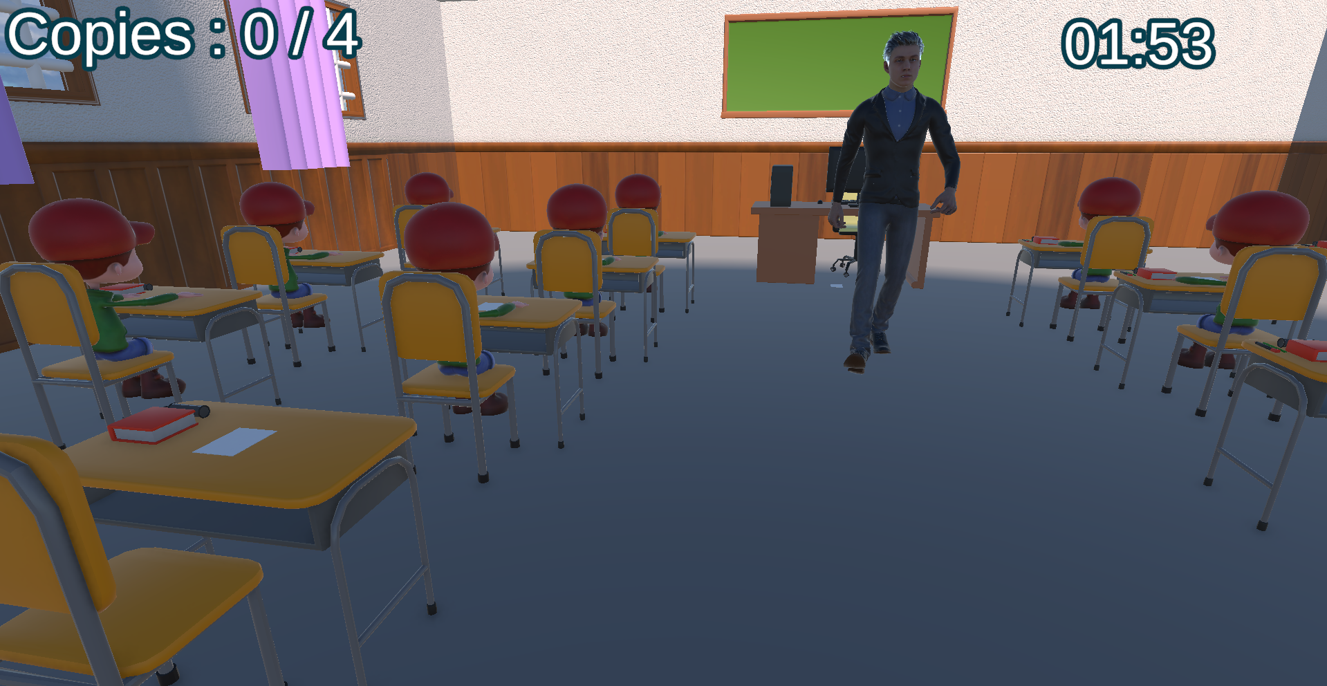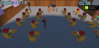 Bonjour à tous prenez place aujourd'hui est un grand jour. En effet c'est le jour de l'examen mais comme vous êtes fufute vous n'avez pas réviser avant de venir. Donc copier sur vos camarades jusqu'à 4 copies tout ça en 2 min pour pouvoir avoir une bonne note mais faites attentions le prof peut à tout moment vous attrapez en flagrant délits. Puis revenez à votre table celle ou il n'y a personne pour gagner la partie.